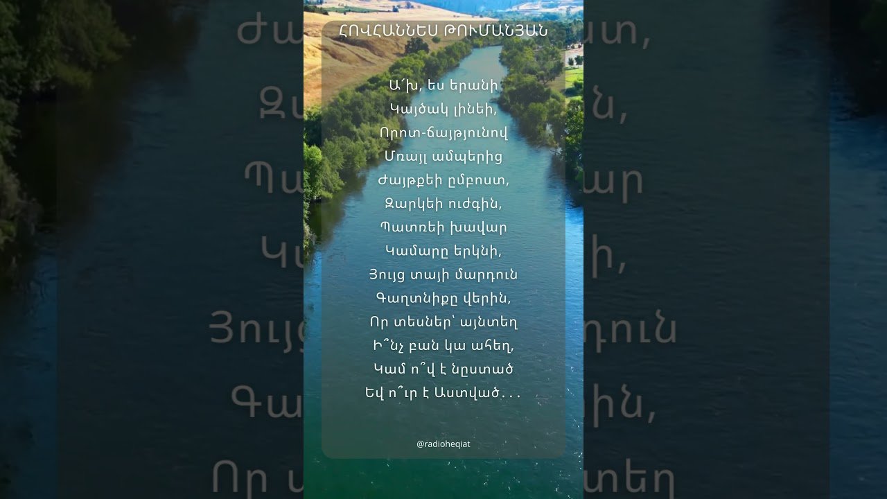 Share Facebook Twitter LinkedIn Pinterest Email Հովհաննես Թումանյան Ախ, ես երանի #tumanyan #hovhannestumanyan #թումանյան #հովհաննեսթումանյան source Post Views: 49 Share this: Share on Facebook (Opens in new window) Facebook Share on X (Opens in new window) X Like this:Like Loading... armenia Asmunq Hovhannes Tumanyan poezia radio heqiat radioheqiat radioheqyat shorts Tumanyan ասմունք բանաստեղծություններ Թումանյան Թումանյան Բանաստեղծություններ հայ հայաստան Հայկական Հովհաննես Թումանյան Հովհաննես Թումանյան Բանաստեղծություններ պոեզիա ռադիո հեքիաթ քառյակներ