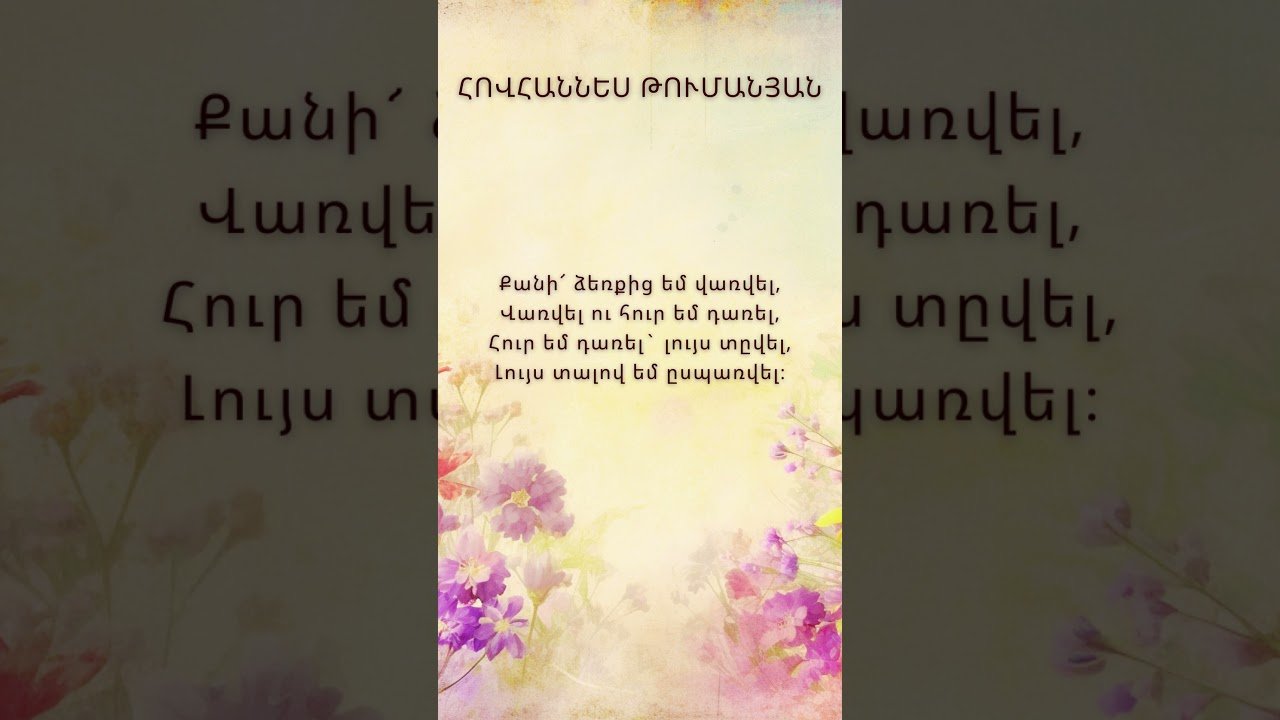 Share Facebook Twitter LinkedIn Pinterest Email Քառյակներ Հովհաննես Թումանյան Քանի՜ ձեռքից եմ վառվել#tumanyan #hovhannestumanyan #թումանյան #հովհաննեսթումանյան source Post Views: 3Share this: Share on Facebook (Opens in new window) Facebook Share on X (Opens in new window) X Like this:Like Loading...armenia Asmunq Hovhannes Tumanyan poezia radio heqiat radioheqiat radioheqyat shorts Tumanyan ասմունք Թումանյան հայ հայաստան Հայկական Հովհաննես Թումանյան Հովհաննես Թումանյան Քառյակներ պոեզիա ռադիո հեքիաթ քառյակներ