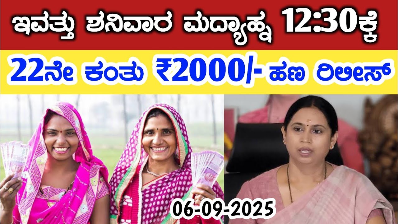 ಇವತ್ತು ಶನಿವಾರ ಮದ್ಯಾಹ್ನ 12:30ಕ್ಕೆ 22ನೇ ಕಂತು ₹2000/- ಹಣ ರಿಲೀಸ್/ gruha Lakshmi Yojana latest news today